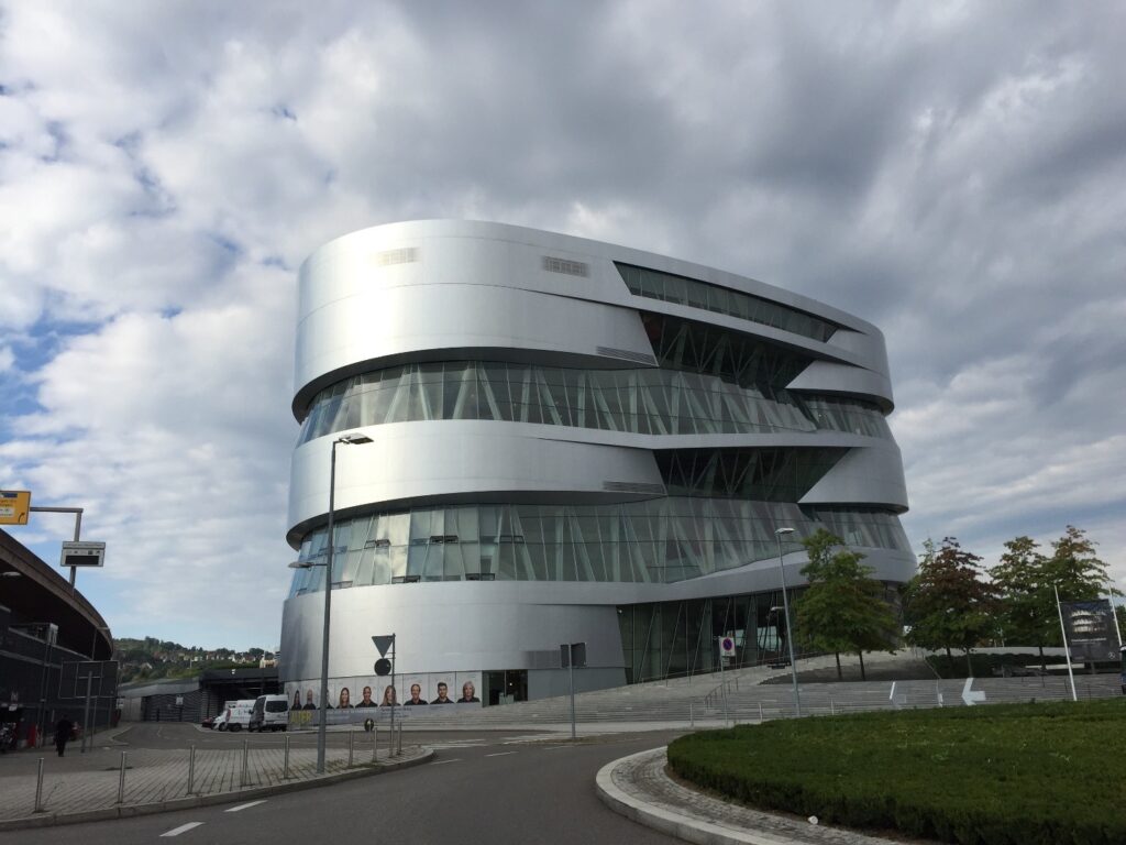 외관 모습입니다 — 독일 슈투트가르트에 있는 자동차 역사 박물관으로, 독특한 곡선형 디자인과 알루미늄·유리 외장으로 유명합니다.