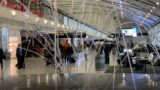 最終的な展示施設が完成するまでの一時的な展示として仮設ハンガーに支えられた状態で展示されていました。この展示では、見学者がシャトルの下部や側面を間近に観察できるようになっており、機体の外装や耐熱タイルの損傷跡など、宇宙飛行の痕跡を直接見ることができました。そして、なんといっても機体の巨大さは圧巻です。